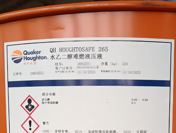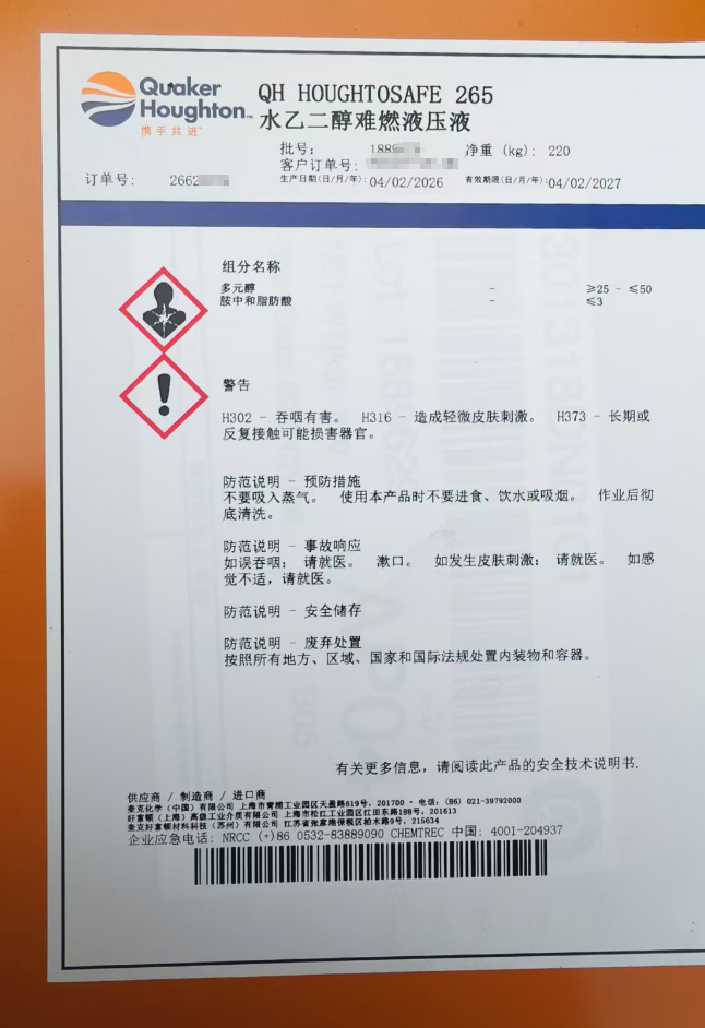 奎克好富頓QUAKER HOUGHTON QH HOUGHTOSAFE 265水乙二醇難燃液壓液是一種優佳的水-乙二醇類難燃液壓液,為在壓力條件下、靠近明火或高溫場合使用而設計,能提供較大限度的安全性。奎克好富頓水-乙二醇難燃液壓液設定了衡量其他水-乙二醇類液壓液的性能標準。由水、乙二醇及特種高分子聚合物等組成,適用于有火災險情及高溫環境下的液壓系統。